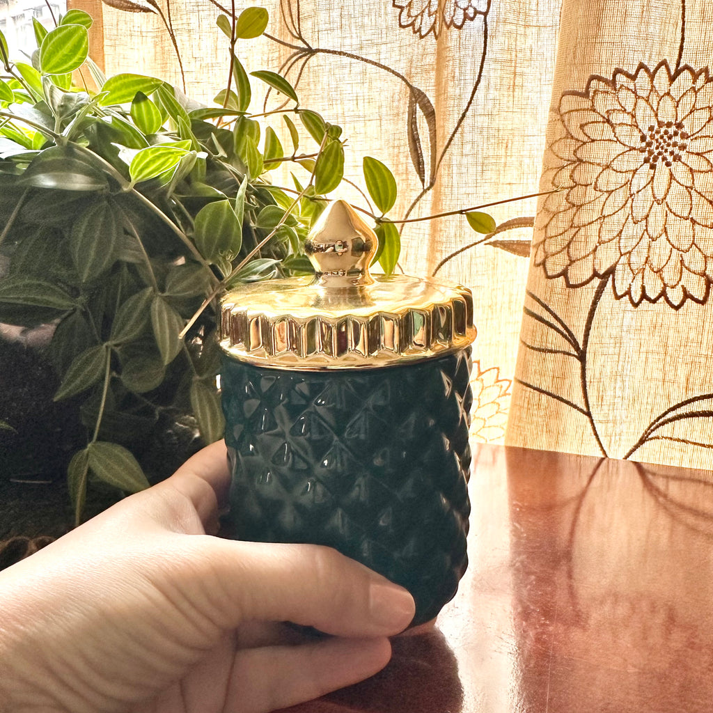 Beautiful green and gold jar with a twist top.