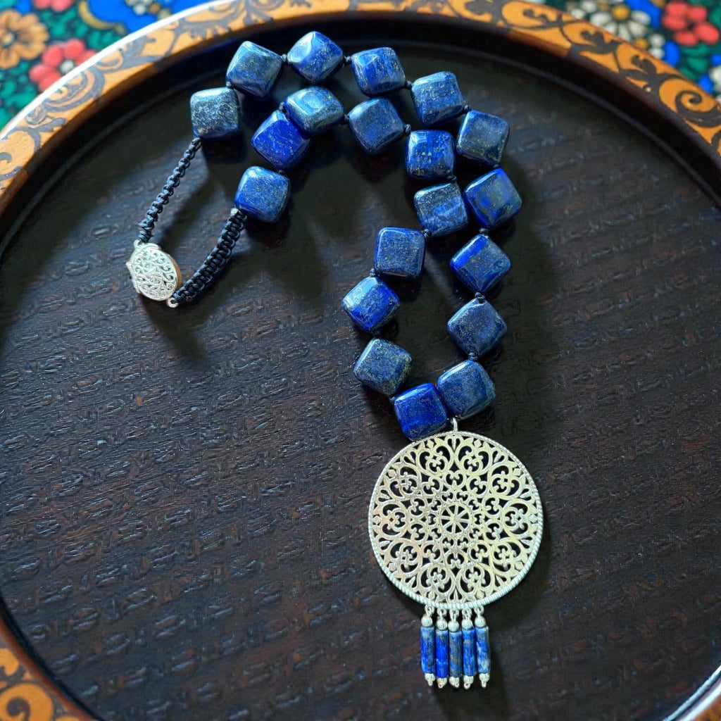 Stunning Lapis necklace with a beautiful 925 sterling silver Ajourè pendant.